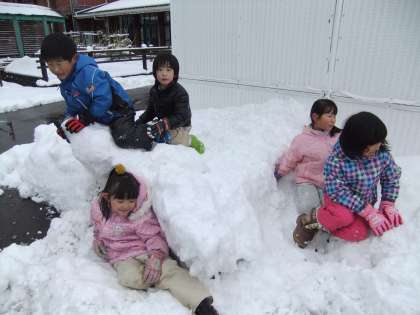 待ちに待った雪が積もりました。「雪遊びする?」と朝から楽しみにしていた1年生。1時間目さっそく外へ飛び出しました。運動場で雪合戦、親水公園ですべり台、駐車場の除雪車が集めてくれた雪だまりでは、おうちごっこ。「ここは、いすみたい。ここはベッド。みんなで寝よう。」次々と遊びが広がりました。「子どもは遊びの名人」というのは本当だと思いました。