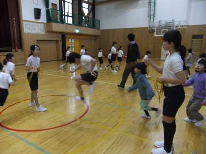 雨が続いてまだ1度も朝マラソンが走れていません。かわりに、全校で大なわとびをしています。2月には全校なわとび大会があるので、それに向けて練習にも熱が入ります。1年生のために、6年生が特別練習場を作ってゆっくり回してくれています。1回目はぜんぜんとべなかった1年生も、2回目には少しとべるようになりました。