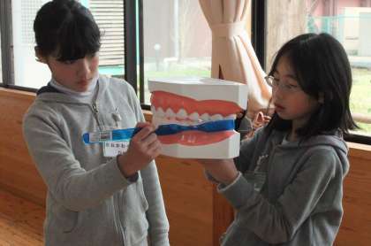 二小では、歯磨きの歌を使ってそれに合わせて歯磨きをすることで、すべての歯をしっかり磨けるようにしています。入学したばかりの1年生はその磨き方を知らないので、旧保健給食委員会が給食後の歯磨きのとき、大きなハブラシと歯を使ってお手本を見せてくれています。それをするために、給食を食べたらすぐに歯磨きを済ませてくれている保健給食委員会のお兄さん、お姉さん、ありがとう。