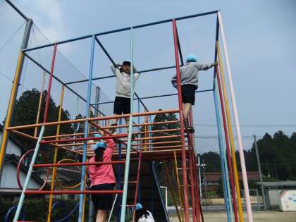 今日、体育の授業で総合遊具の遊び方を学びました。そして,楽しみにしていた総合遊具すべてで遊べるようになりました。子どもたちは滑り台がスピードが出て楽しかった。と言っていました。