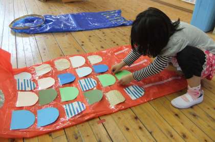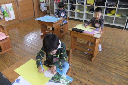 図画工作科でこいのぼりを作りました。はさみの使い方と渡し方、型紙の写し方を学習したあと、おうちから持ってきた包装紙に型紙を写してはさみで切り取り貼り付けていきました。セロハンテープの順番でケンカしそうになると「なかよくしよう。」と自然に声が出て、今日も1つ「きらきら」が見つかりました。