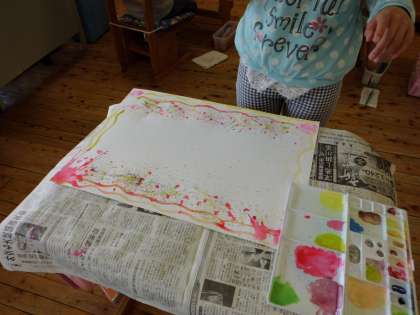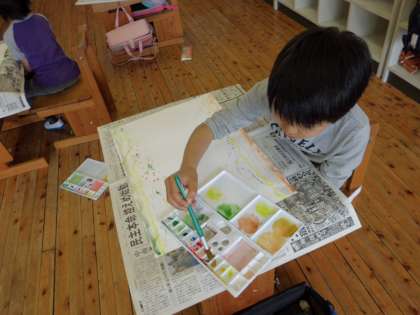 4月17日は図画工作の時間に水彩絵の具を使ってさまざまな色を作ったり,ぬり方を工夫したりして楽しみました。絵を描くのではなく,ただ混ぜてみたい色を混ぜてみたり,好きな描き方をしてみたりすればいいんだよと伝えると,全員が黙々と活動をしていました。出来上がった作品には全員が満足な表情。この紙に学級目標を書いていきます。