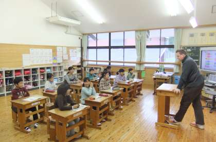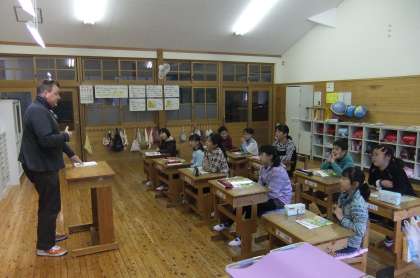 今日は初めての外国語活動、英語の学習がありました。まず先生とあいさつの練習。その後、友達と二人組みであいさつをしました。先生にいろいろ質問したり、名札を作ったりして、楽しく1時間を過ごしました。