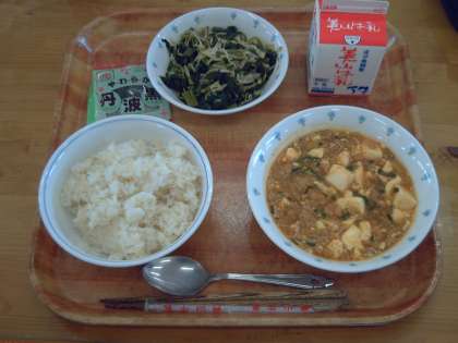 今日の献立は,麦ごはん・牛乳・マーボー豆腐・ほうれん草ともやしのいためナムル・黒大豆でした。マーボー豆腐は少しピリ辛の風味とケチャップ味で,ごはんによく合っておいしかったです。ナムルはさっぱりとしていて,少し暑くなってきた季節にぴったりでした。