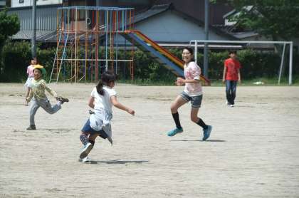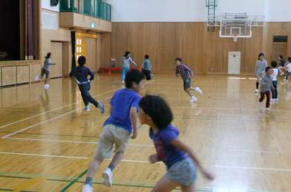 色べつ遊びでは、全校では遊べない少人数の遊びを楽しむことができます。ホールではハンカチ落としを楽しんでいます。体育館や運動場では、少ない人数で思いっきり走り回ることができています。全校遊びとはまた違った楽しみ方です。