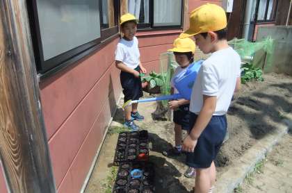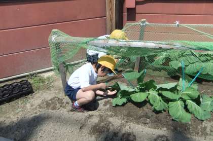 虫めがねを持って一生懸命キャベツの葉っぱを見ています。モンシロチョウのたまごを探しているのです。理科学習の続きを休み時間にしています。たねまきした植物に水をあげている子もいます。「ついでにほかの植物にもやっておこう。」と学校園や植木鉢にも水をあげていました。ありがとう。