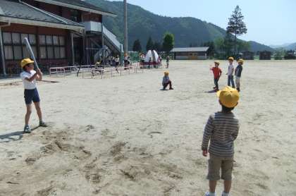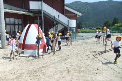 全校遊びや色別遊びの時間以外にも子どもたちはさまざまに遊びます。今日は4年生、2年生、1年生混じって野球をしている子どもたちや、作ってもらった竹馬の練習している子どもたちの姿が見られました。異学年で上手に関わり合って遊ぶことができるのも二小のよいところです。