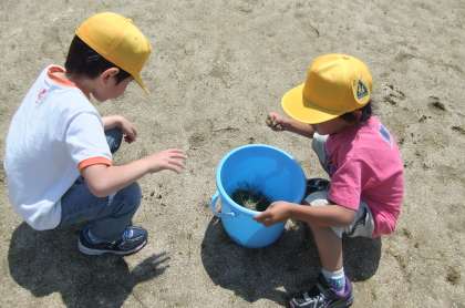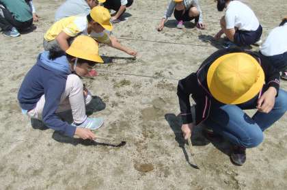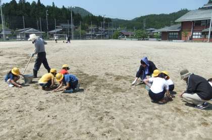 雨上がりを見計らって、そうじは草引きになります。「抜きやすい!」と子どもたちも喜んで競うようにして草を引きました。低学年は手で、高学年は鎌で、どちらもたくさん引きました。