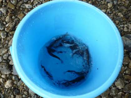 上桂川漁業協同組合のお力を得て、今年も鮎の放流体験を行ないました。はじめに、調べ学習での発表(パワーポイントを使ってまとめたもの)を行った後に、実際にバケツを手にとって、鮎の稚魚を組合の方から受け取りました。