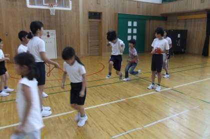 5年生が不在ですが、雨のため朝活動はマラソンではなく八の字とびになりました。1年生もだいぶ上手になり、色の練習場へ移っていく子が増えました。