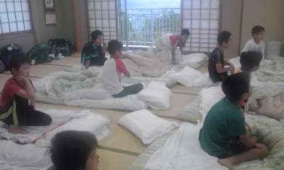 最終日の朝です。これまで使ってきた布団やシーツをたたみます。