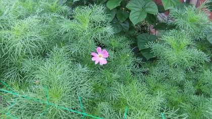 去年はあさがおなどがたくさん鹿に食べられてしまいましたが、今年は裏にも表にも網をはり、毎日閉めたり開けたりしているおかげで、被害は玄関前のプランターのお花のみのようです。網に守られて秋の花コスモスが大きく伸びすでに花も咲き始めました。ミニトマトやきゅうりも大きくなり実をつけ始めました。