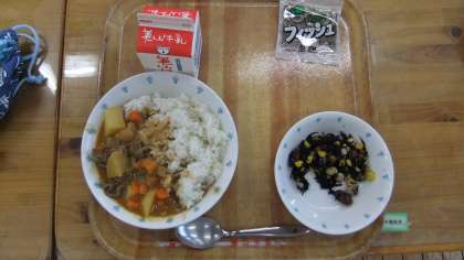 給食当番は手をきれいに洗ってエプロンやぼうしを身につけ、すぐに配膳に取り掛かります。当番以外の子は、当番のかわりにハブラシ・コップを準備したり、静かに座って待っていたり、どの子も給食が早く食べられるように協力しています。おかげで、ほとんどの子が時間内に食べ終わることができています。残菜もほとんどありません。てきぱき動くことで楽しい時間が増えることを、子どもたちはよく知っているのです。
