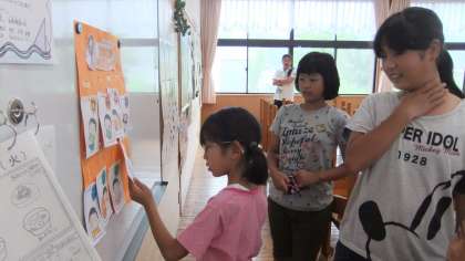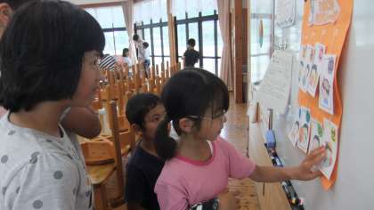 栄養士の先生が来られて、しっかりかむことの良さをお話しして下さいました。合い言葉は「ひみこのはがいいぜ」です。給食を食べた後そのカードをめくって合い言葉を確認している子どももいました。