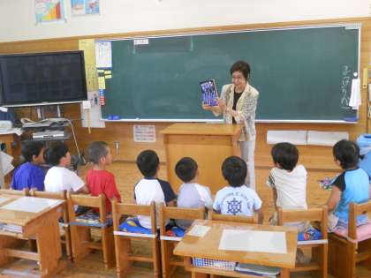 京北お話しの会の先生が1年生に読み語りをしてくださいました。今日の本のタイトルは「ねこのはなびや」です。子どもたちはねこの花火の競争大会のお話しを楽しみながら聞いていました。
