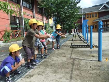 「なつとあそぼう」と夏休み前に水遊びをしましたが、お休みの子がいたので、夏休み後にもう一度やりました。「まとあてやりたい。」「とばしっこ、またしよう。」とみんなで楽しく遊びました。