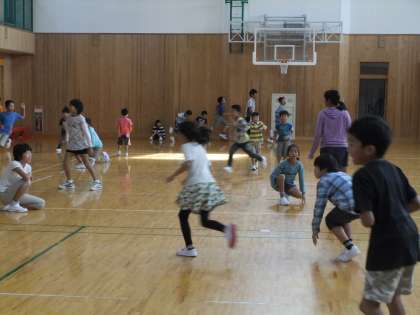 運動場がぬれているので体育館での全校遊びでした。こおりおにを楽しみました。