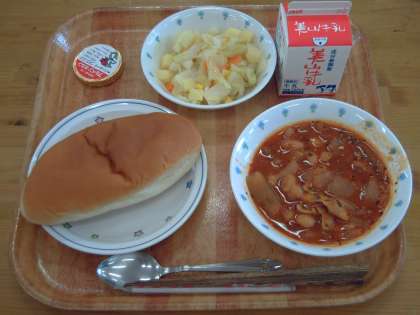 今日の献立は,ミルクコッペパン・牛乳・とら豆と鶏肉のトマト煮・野菜のホットマリネ・チーズでした。豆をたくさん食べられるようにとシチューに豆を入れてあります。とら豆はあっさりしているので,いろいろな料理に合います。野菜のホットマリネはりんご酢のさっぱりとした味つけでおいしくいただきました。