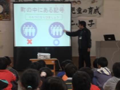 今日の朝会は、作文にがんばったお友だちの表彰と、教頭先生のお話でした。さまざまな記号がさまざまに工夫されてあることがわかって、子どもたちも意欲的に感想を発表していました。