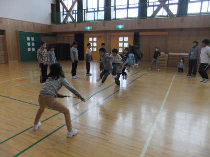 去年まで低学年は、「大波小波の小波だけ」という種目をとんでいましたが、今年から低学年も「みんなでジャンプ」に挑戦です。回し役も高学年ではなく、低学年のリーダー3年生が回します。今日初めて練習がありました。最初はなかなかリズムが合わずひっかかってばかりでしたが、だんだん呼吸が合うようになり、どの色も10回くらい連続でとべるようになりました。5,6年生がつきっきりでいろいろアドバイスをしてくれるので低学年も安心です。