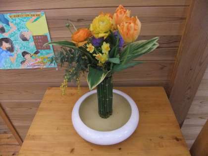 二小の正面玄関の花飾りは,いつも素敵なお花が飾られています。また,来校された時,正面玄関の花飾りを見てみてください。
