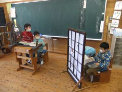 音読発表会に向けて班ごとに音読の練習をしています。ただ読むだけでなく、おかみさんやたぬきのせりふを考えて入れながら読みます。本物の糸車ややぶれしょうじも使ってお話の世界を楽しんでいます。