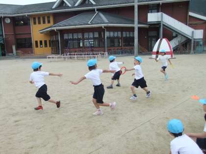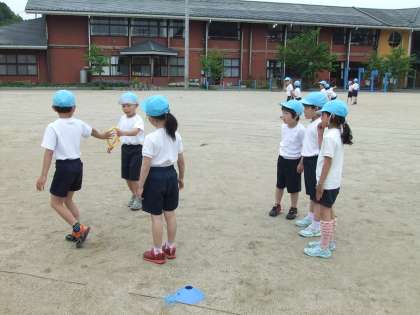 1,2年生合同で、最後のリレー遊びの学習をしました。遊びといいながら、運動会のリレーを意識した本格的なリレーです。今日は最後なので自分たちの色のできていないことを、色別練習で何度も繰り返し練習しました。2年生が1年生をリードして、バトンの受け方、渡し方、走り方など、一生懸命1年生に教えてくれました。2年生のおかげで1年生もとても上手にリレーができるようになりました。