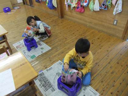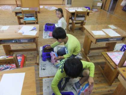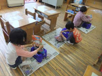 1人1人自分のあさがおを育てます。植木鉢に土を入れて、3粒のたねを、けんかしないように離してまきました。きれいな花が咲くといいなと、ていねいに作業を進めていた1年生でした。