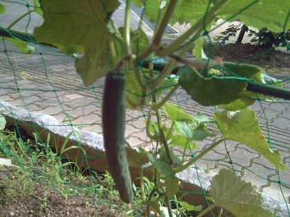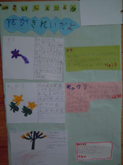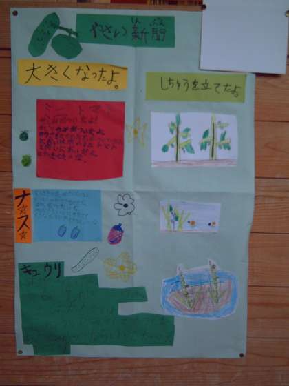 2年生では、きゅうり、なす、ミニトマトを育てています。きゅうりが1本大きくなり、そろそろ収穫です。大きくなっていく様子を書いた新聞第1号ができました。