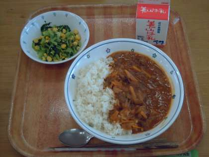 今日の献立は,麦ご飯・牛乳・ハッシュドビーフ・ほうれん草のソティでした。小麦粉とバターをいためて作っていただいたルーにトマトの味がよくなじんでおいしかったです。今日は,ほうれん草の代わりに小松菜が届きました。新鮮な小松菜でシャキシャキと歯ごたえがあっておいしかったです。