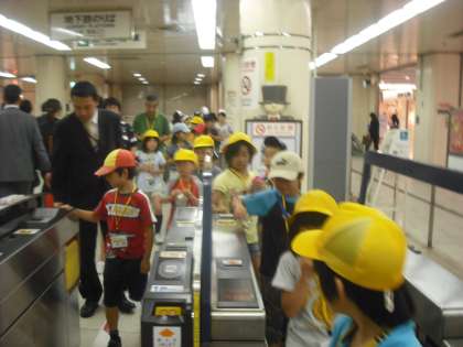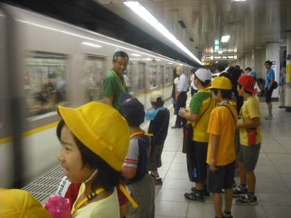 7月10日 京都市を少しでも多く知ってもらうために子ども達と一緒に行っている「京都市を知ろう!探検隊」も今年で5回目となりました。朝,8時45分に「京都市を知ろう!探検隊パート5」と書いたバスに22人の子ども達を乗せたバスで学校を出発し,二条城・京都タワー・将軍塚・マンガミュージアムと観光地をまわりました。特に今回は烏丸御池から京都駅まで地下鉄で移動しました。一人一人が切符を買い,改札口を通りました。はじめての子どももいて良い体験になりました。