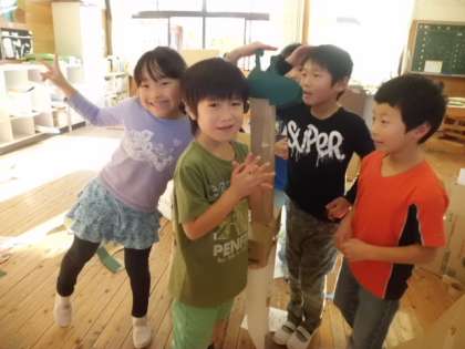 ダンボールを開いたり,つなげたり,切ったり,囲ったりして,家や家具,キリンを作って楽しみました。