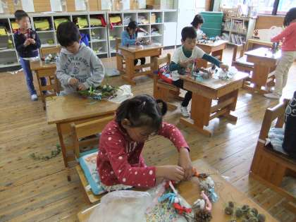 ナンテンや綿の実、まつぼっくりなど、おうちから思い思いの飾りを持ってきて、アサガオのリースに飾りをつけていきました。「おばあちゃんが『友だちにもあげや。』って持たせてくれはった!」とたくさん持ってきた子は友だちもわけてあげていました。素敵なリースができたので、また参観日などで学校に来られたときに見てあげてくださいね。