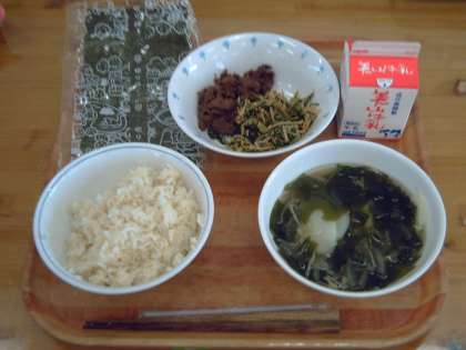今日の献立は,セルフのりまき・牛乳・わかめスープでした。セルフのりまきは,韓国風の料理で,みそや砂糖,ごま油などで味つけした牛肉と,野菜のナムルをのりまきで巻いていただきました。手巻きずしのようでおいしかったです。