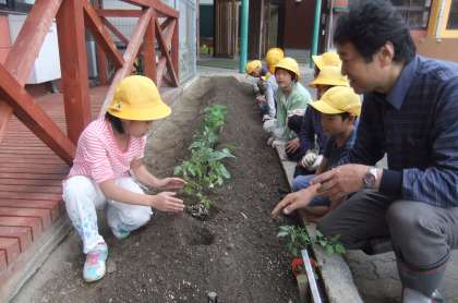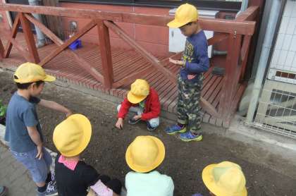 お昼から行う予定でしたが,雨の予報だったので朝に変更をし,元気よく種と苗を植えました。最初はどきどきしながらも種を一粒一粒丁寧にまいていきました。5種類の野菜を植え,これからどんな実をつけるのかみんな楽しみにしています。
