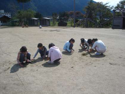 10月5日 今日は,運動会や区民運動会でお世話になった運動場に感謝をこめて草引きをしました。全校で運動場のあちこちに別れ,心地よい汗をかきながら頑張りました。昨日の雨で,少し水を含んでいて草引きにはグッドコンディションでした。