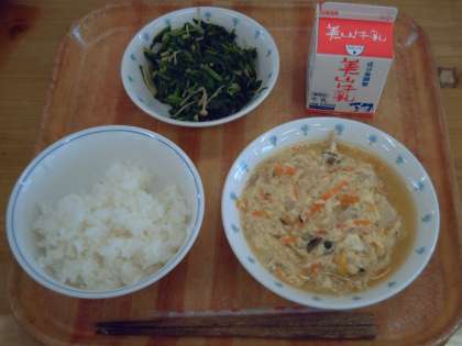 今日の献立は,ごはん・牛乳・高野豆腐の卵とじ・煮びたしでした。煮びたしに入っていたほうれん草は京北でとれたもので,色が鮮やかで歯ごたえもシャキシャキしていておいしかったです。今日は,しめじとえのきと2種類のきのこが入っていました。きのこが少し苦手だという子ども達もいましたが,がんばって残さずに食べられました。