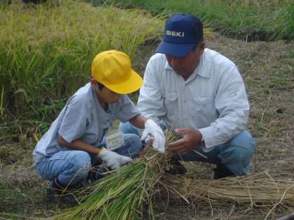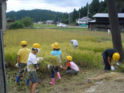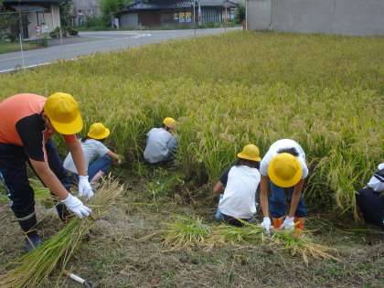 10月5日 今日の午後,5年生が稲刈りに行きました。地域の方(保護者)の田んぼの一角を借り,6月に田植えしたのが豊かに実りました。田植えから今日の収穫までお世話になった地域の方の指導のもと,慣れない手つきでしたがしっかり稲刈りができました。11月にはこのお米を使って収穫祭を保護者とする予定です。