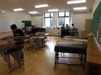 音楽室で,いろいろな楽器を使って合奏の練習をしています。パートごとに分かれての練習風景でした。