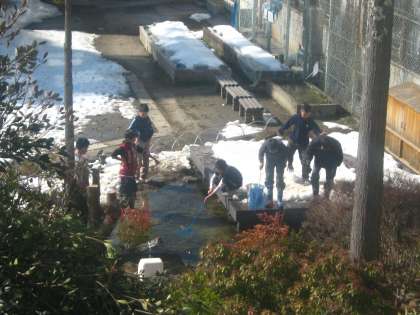 卒業まであと一ヶ月半の6年生 雪解け運動場横のビオトープでメダカと遊んでいます。