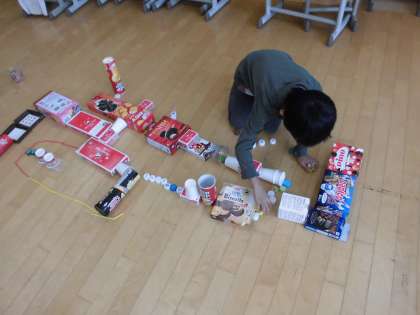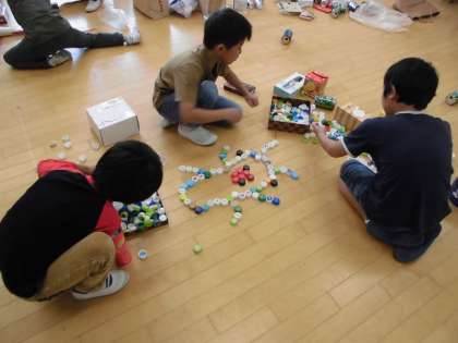 「身の回りのものをならべるとどんな形ができるのでしょうか。」ペットボトルのふたや空き箱,空き缶,ストローなどを友達と話しながら並べていました。テントウムシ,船,文字,ピタゴラスイッチなどを作っていました。