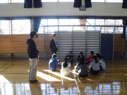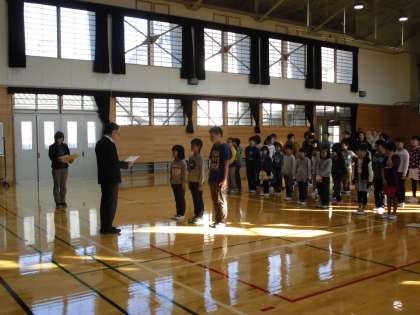 全員合唱の後は,絵画展で優秀な作品として認められた子どもたちの表彰式がありました。朝会が終わった後,昨日の大文字駅伝の予選会で頑張った6年生たちに,校長先生からお話がありました。
