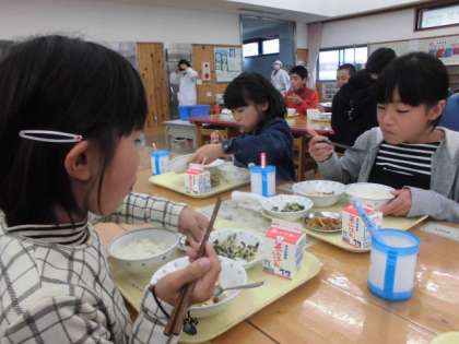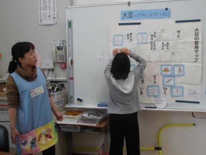 今日の食の学習は,「大豆がどんなものに変身するかな」「大豆のいいところはどんなところかな」と,今,国語で学習している真っ最中の内容でした。楽しみながら,大豆について知ることができました。いり豆をすりこぎですって,きな粉にする体験もして,「いいにおい!!」と感激していました。