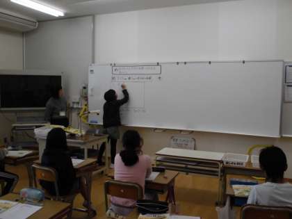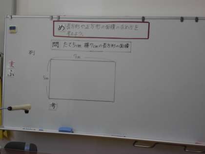 今日は,長方形と正方形の面積の求め方の学習をしました。教材提示装置を使って,自分の考えを発表していました。