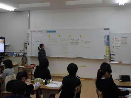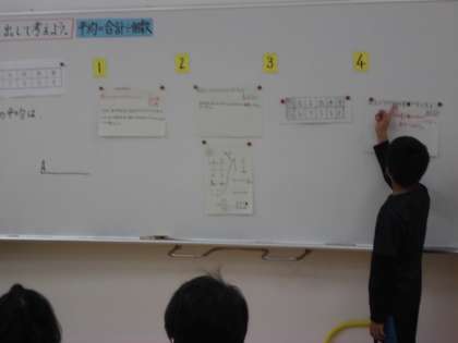 平均の学習をしました。まず,自分の考えを持ち,班で交流し,班の代表がみんなの前で発表する形式です。