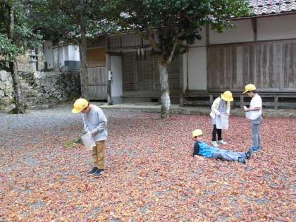 学校の近くの神社には紅葉がたくさん落ちていて,絨毯のようです。そこで,葉っぱを集めたり,座ったりして遊びました。教室に戻って,集めた葉っぱを使って絵を描きました。