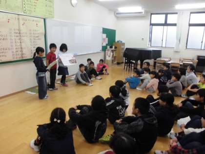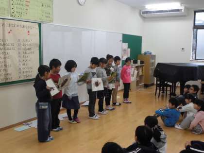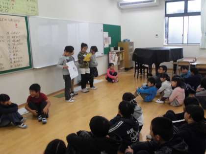 今日は,2年生の発表がありました。教室で飼っていたカタツムリに関係するクイズでした。楽しい絵も交えてカタツムリに関する知識が増えました。