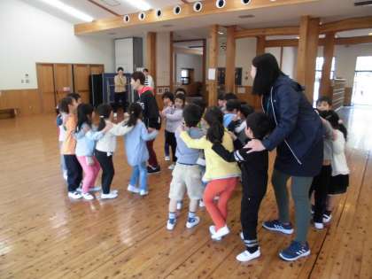 第1回の合同学習で,自己紹介の後,「おちたおちた」ゲームと「じゃんけんれっしゃ」ゲームをして楽しみました。
