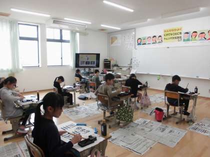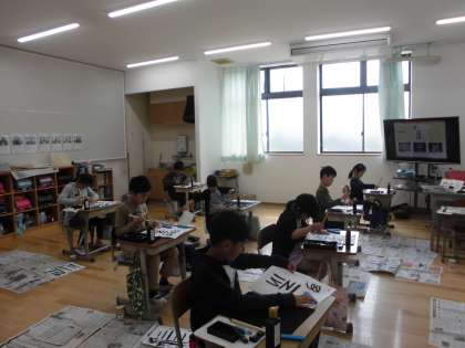 毛筆用具の並べ方や扱い方,筆の持ち方について学習した後,筆でいろいろな線を書きました。はじめは緊張していた子どもたちも徐々に緊張がほぐれ,線を書くことを楽しんでいました。最後の後片付けも丁寧にしっかりできました。