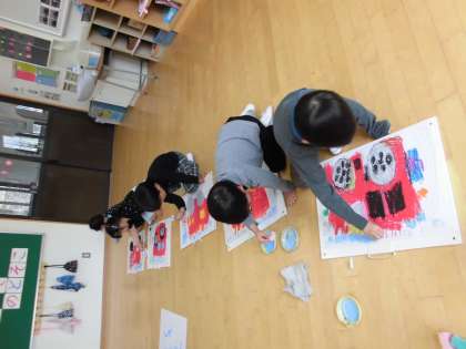合同学習の時に描いた消防車の絵を仕上げました。クレパスで濃く塗った後,スポンジに絵の具をつけて周りをポンポンしました。みんな楽しく活動していました。